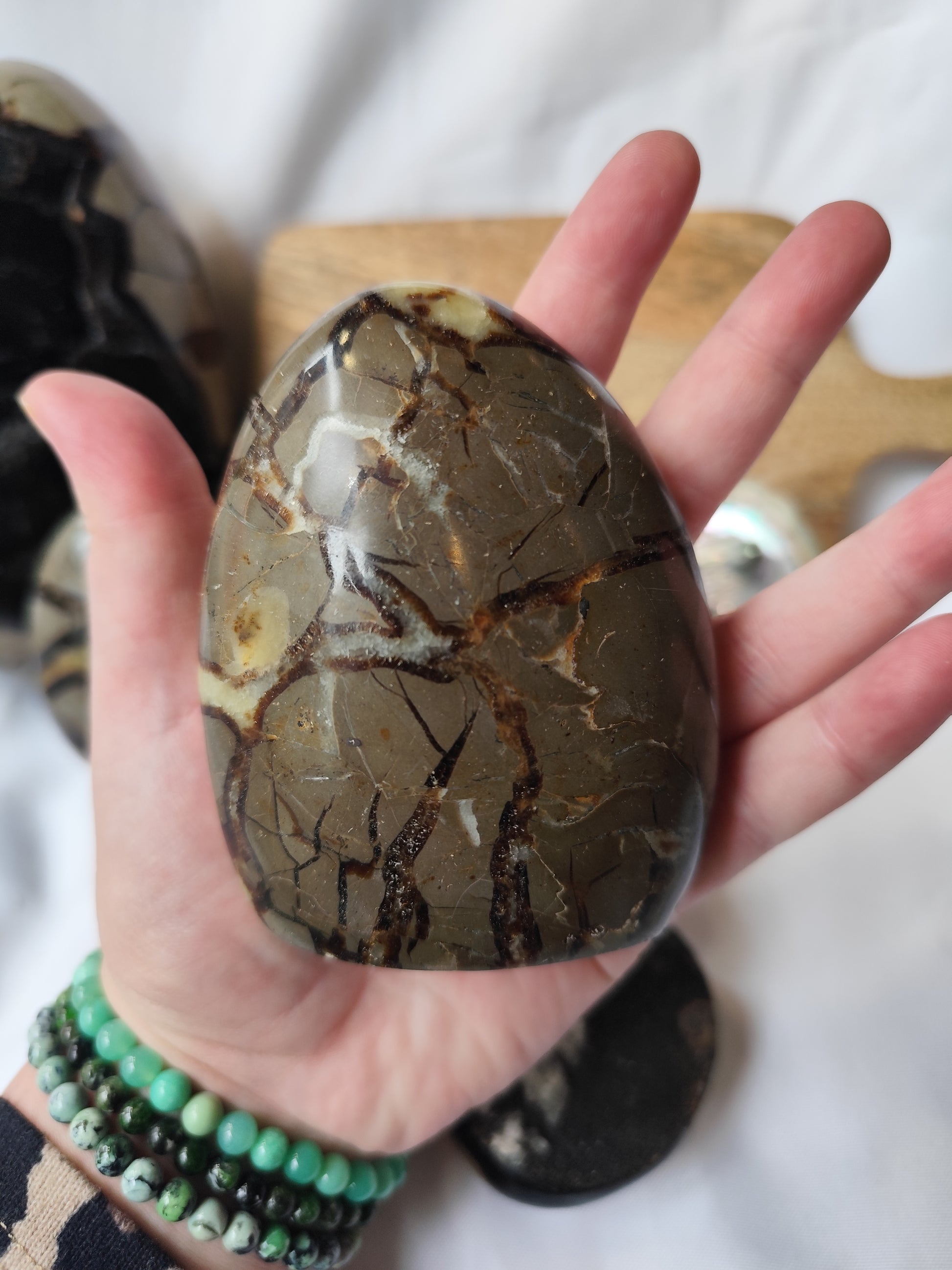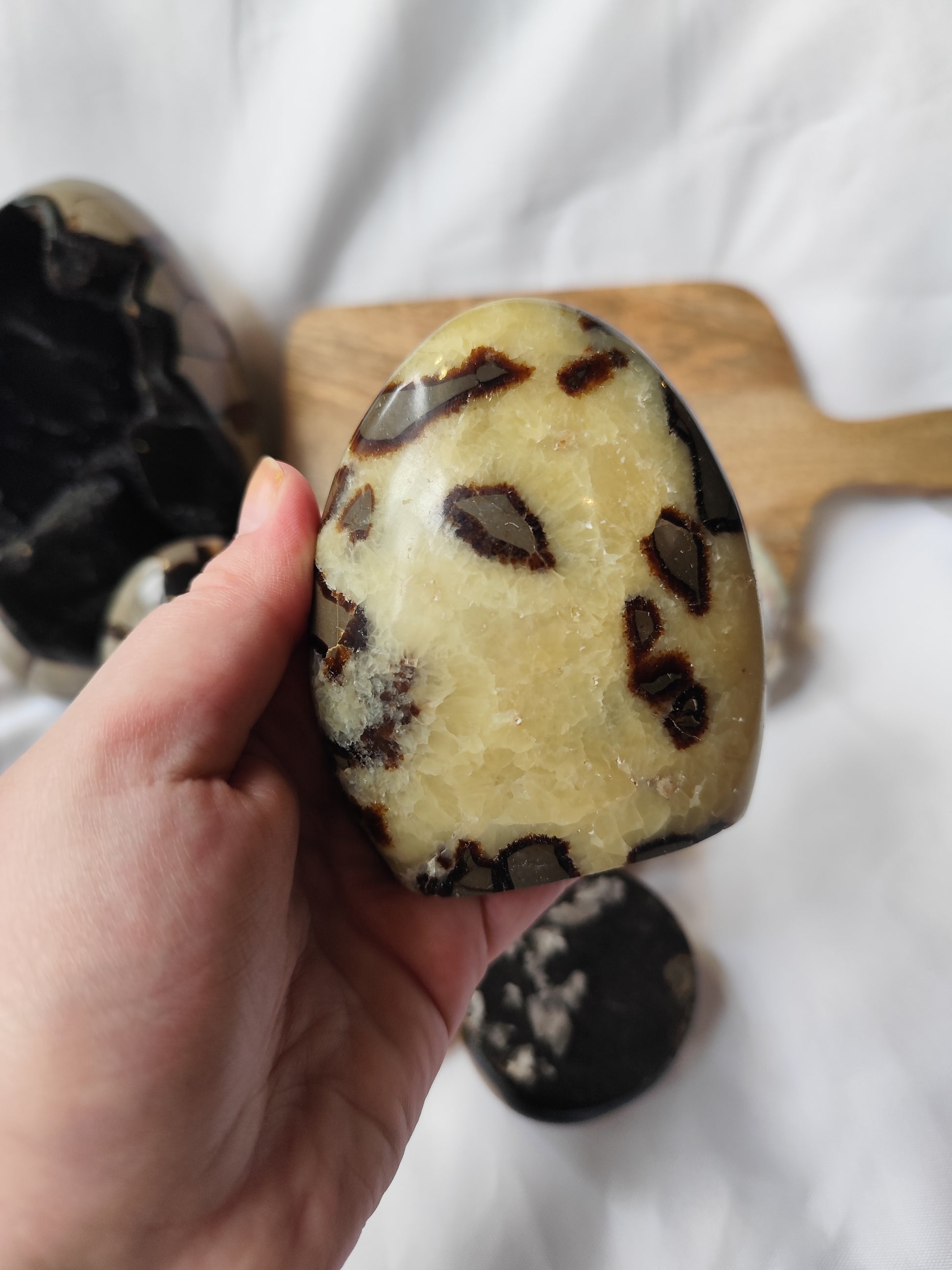 La Septaria, aussi appelĂ©e pierre du dragon, est une roche unique formĂ©e il y a des millions dâannĂ©es par la combinaison de calcite, aragonite et argile. Son apparence fascinante, marbrĂ©e de veines dorĂ©es et brunes, Ă©voque la puissance de la Terre et la sagesse ancienne. Chaque pierre roulĂ©e de Septaria est une crĂ©ation naturelle unique, aux formes et motifs singuliers.