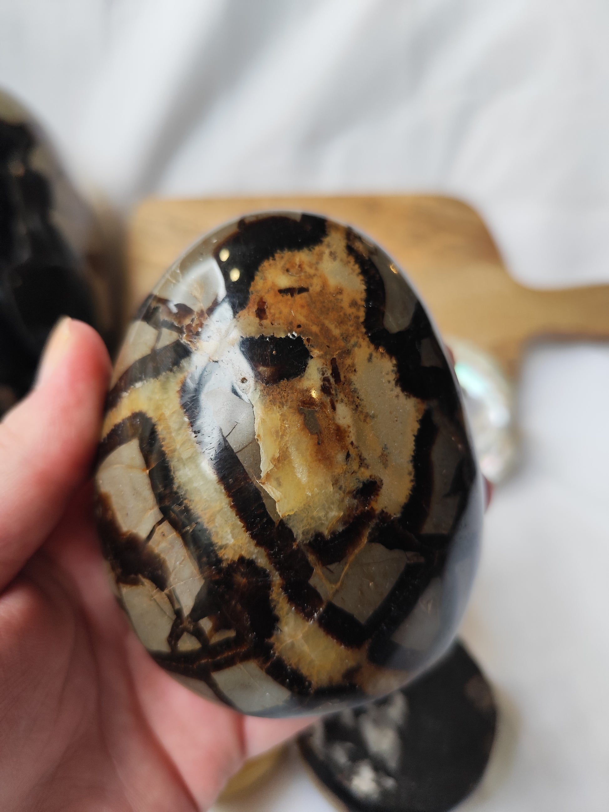 La Septaria, aussi appelĂ©e pierre du dragon, est une roche unique formĂ©e il y a des millions dâannĂ©es par la combinaison de calcite, aragonite et argile. Son apparence fascinante, marbrĂ©e de veines dorĂ©es et brunes, Ă©voque la puissance de la Terre et la sagesse ancienne. Chaque pierre roulĂ©e de Septaria est une crĂ©ation naturelle unique, aux formes et motifs singuliers.